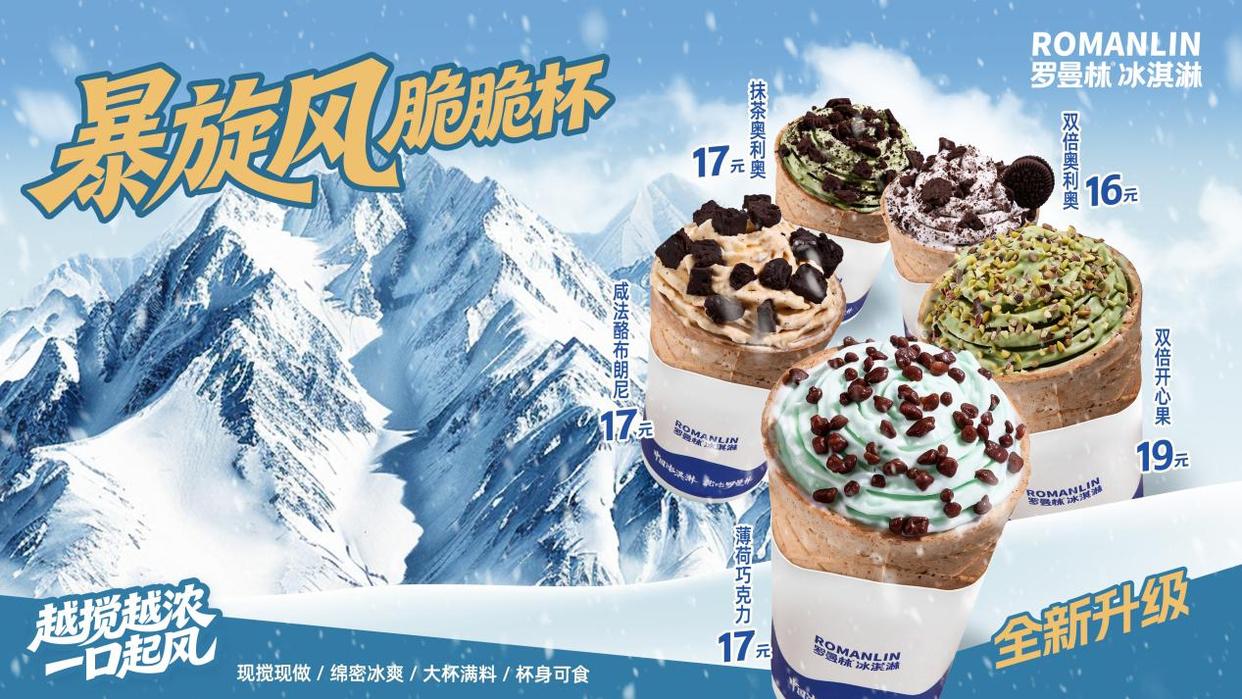 经典产品“暴旋风”系列也迎来全面升级,包装从普通纸杯升级为华夫脆脆杯,质感与手持体验显著提升;同时新增薄荷巧克力、咸法酪布朗尼等限定口味,以“经典基底+潮流风味”的搭配,既留住老顾客的熟悉口感,也为新客提供充足尝鲜动力。